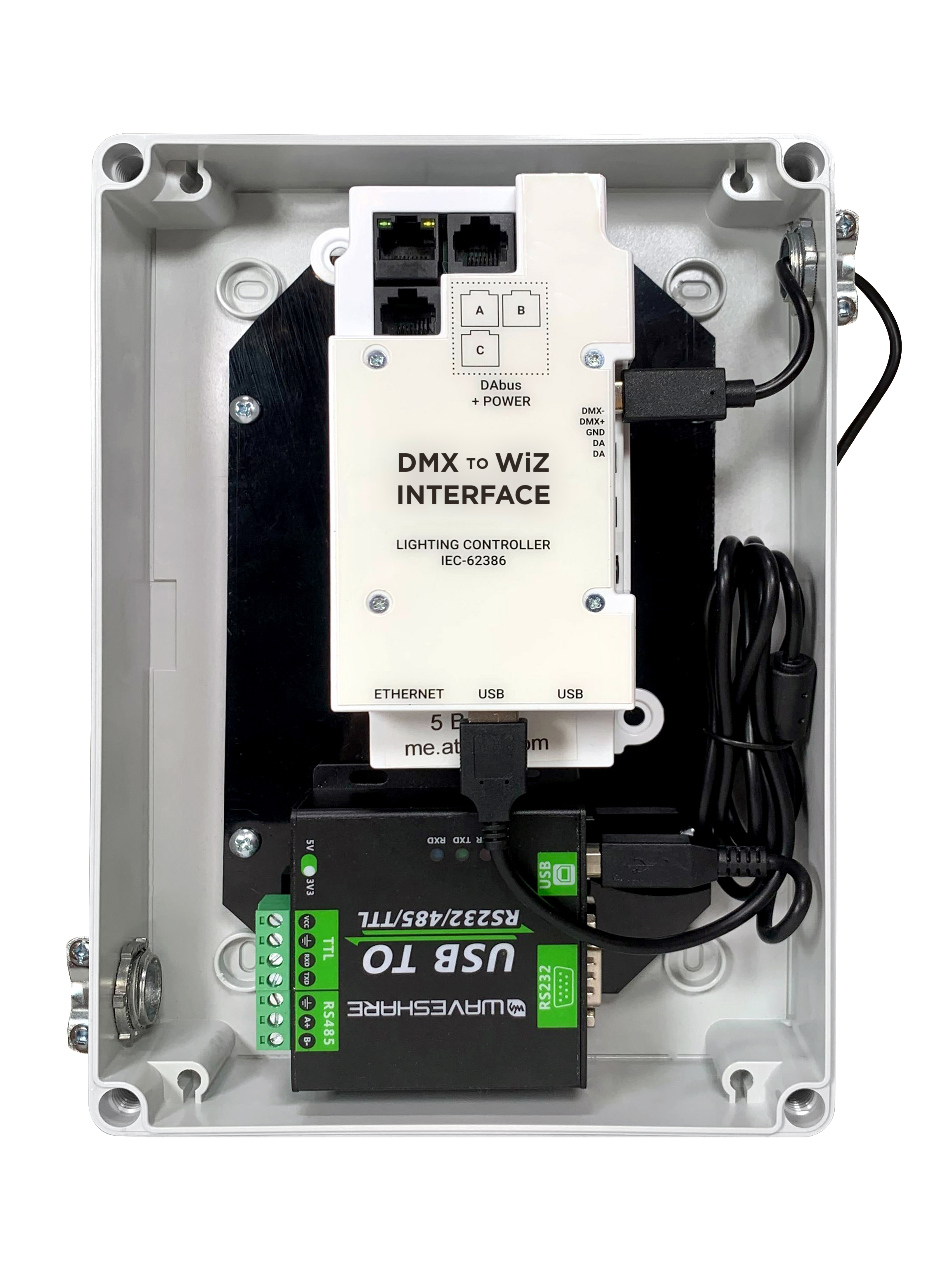 This DMX to WiZ Interface allows for WiZ Pro-Enabled devices like the Pure Smart TruColor RGBTW smart bulbs to be controlled by any control/homeautomation system with DMX compatibility. This could be a DMX gateway/ interface, a DMX console, or a standalone DMX controller. The DMX to WiZ interface takes the DMX input and output a wireless Wi-Fi signal locally on the WLAN to the WiZ enabled device(s). The devices can then be named, addressed, and/or zoned however the application necessitates.